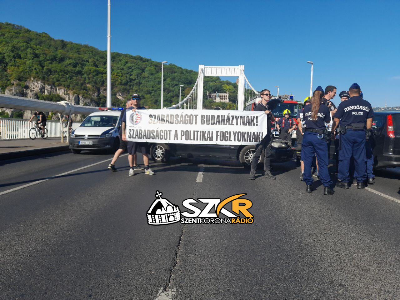 Szabadságot követelnek Budaházynak hazafiak a budapesti Erzsébet híd lezárásával.Mintegy kéttucatnyi bátor harcos (több hazafias szervezetből és szervezet függetlenül is verbuválódva) lezárta a hidat mai napon is, reggel 8 órakor, az egyébként 2002-es július 4-ei hídblokádra is emlékezve.