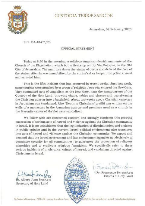 “Ma reggel 8:30-kor egy vallásos amerikai zsidó férfi belépett a Megostorozás templomába, amely a Via Dolorosa első állomása Jeruzsálem óvárosában. A férfi ledöntötte Jézus szobrát, és megrongálta a szobor arcát. Miután a szentély ajtajának őrzője mozgásképtelenné tette, megérkezett a rendőrség és letartóztatta.