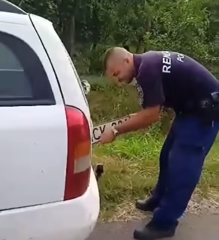 Egy pár másodperces felvételről van szó, ahol egy rendőr gyakorlatilag leszaggatja egy autó rendszámtábláit, majd kicsit oda is suhint a mobiltelefonnal videózó kiilleszkedettnek.
