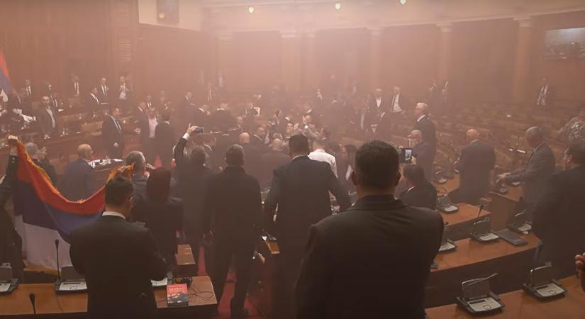 Füstbombák, tojásdobálás és verekedés tört ki a szerb parlamentben (+VIDEÓ)