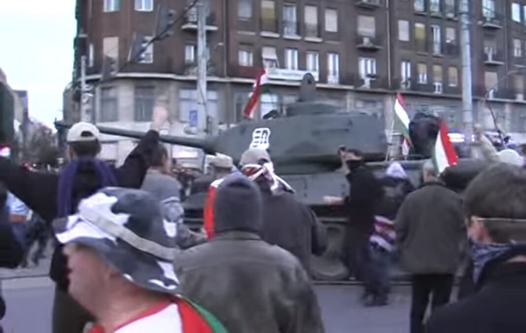 2006. október 23-án a Deák tér közelében látta, hogy a környék tele van tüntetőkkel, és „igencsak lőnek”. „Megmondom őszintén, én is tapostam el könnygázgránátot” – emlékezett vissza később egy interjúban. A Szabadság, szerelem című film forgatásához használt, s az ünnepre kiállított T-34-es tank nyílásáról leverték a lakatot, ő pedig beindította a páncélost. 150 métert megtett vele a tüntetők között, végül demonstratívan megállt a rendőrsorfalnál. Menet közben egy hirdetőtáblát ledöntött, de nem sérült meg senki. „Ez a legnagyobb szerencsém. Ahogy az életemben minden fontos helyzetben, az Isten itt is fogta a kezem.”