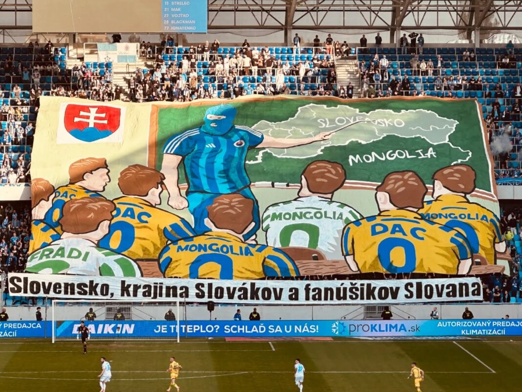 A kifeszített drapérián ráadásul egy térkép is szerepelt, amelyen Magyarországot Mongóliaként azonosítják, illetve egy zöld-fehér mezes Fradi feliratú alak is feltűnik a DAC-osok között.