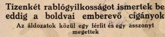 A kassai törvényszék fogházában vannak az emberevő boldvai cigányok, akik vérfagyasztó nyugalommal vallották be, hogy éveken át emberhúst ettek, ami nagyon ízlett nekik. A banda összes tagja hurokra került. Tizenkét férfi és 14 nő van a fogházban. Bűnük talán sohasem derült volna ki, ha egy siketnéma cigány, akit az osztozkodásnál megrövidítettek, föl nem jelentette volna őket.