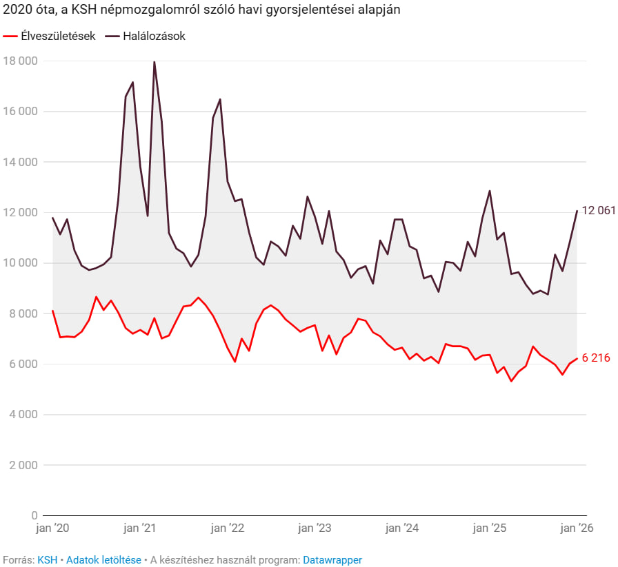 Az előzetes adatok szerint idén januárban 12 061 fő halt meg, míg a születések száma 6216 volt, közölte pénteken a KSH. Januárban még sosem született olyan kevés gyerek, mint idén: tavaly januárhoz képest 2,8 százalékkal csökkent a születések száma, három év alatt, 2023 januárjához képest pedig csaknem 20 százalékos volt a születésszám csökkenése.