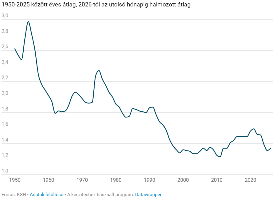 Az úgynevezett teljes termékenységi arányszám egy nőre becsült értéke 1,34, ami elmarad a tavaly januáritól (akkor 1,35 volt), de magasabb a múlt évi 1,31-nél. Persze így is drámaian elmarad a 2,1-es értéktől – ahhoz, hogy egy társadalom népessége bevándorlás nélkül fenntartható legyen, ezt a szintet kellene elérni.